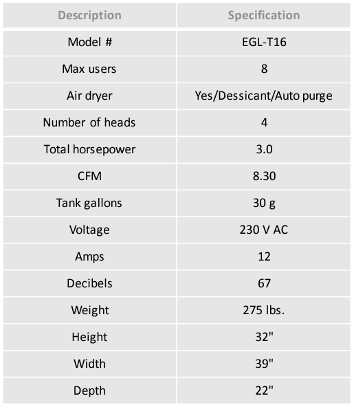 The most essential piece of equipment in your dental practice, can now be your most reliable… Introducing the Eagle-T16 oil-less dental compressor. Hand-pieces can cut through more material with less effort, thanks to powerful, consistent air flow made possible by (x4) AMERICAN MADE 3/4 HP rocking style oil free compressor heads.